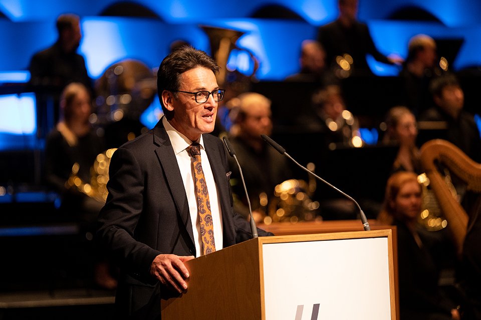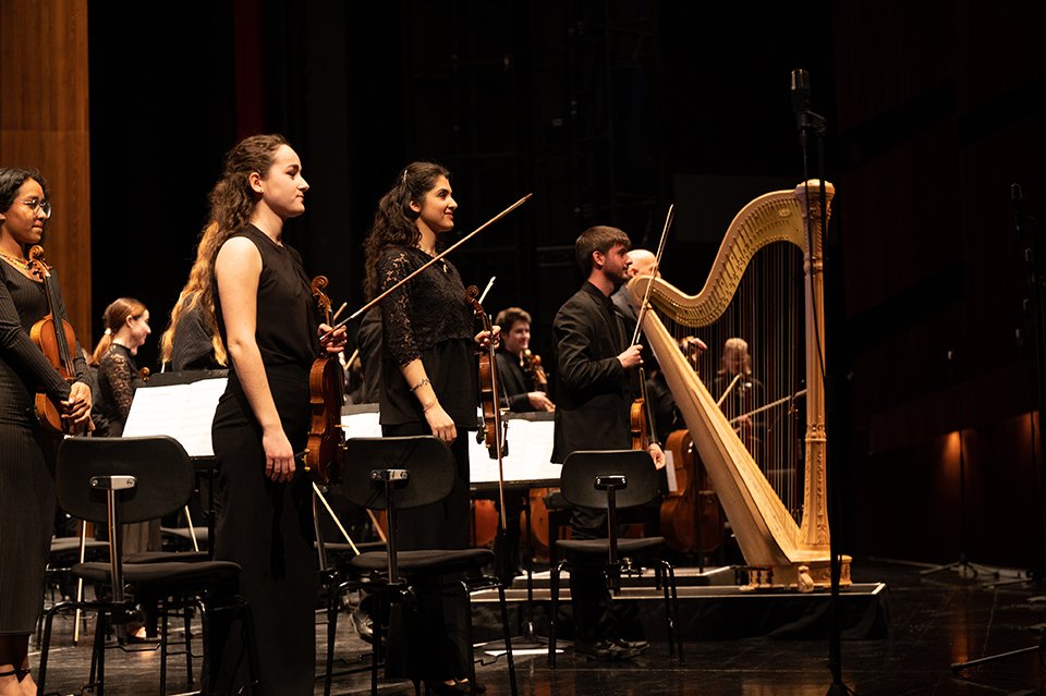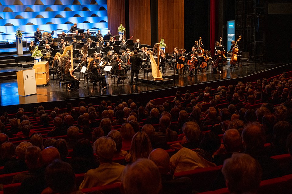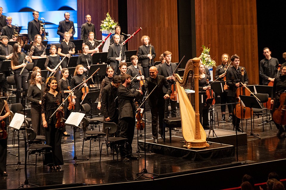 Rund 2.000 geladene Besucherinnen und Besucher erlebten im Festspielhaus in Bregenz und tags darauf im Festsaal der Stella Vorarlberg unvergessliche Momente. Schon die schwungvolle Ouvertüre zu „Candide“ von Leonard Bernstein – bravourös dargeboten von den jungen Musikerinnen und Musikern des Sinfonieorchesters – riss die Gäste in ihren Bann, bevor als weiteres Highlight Albert Zabels Konzert für Harfe und Orchester mit dem Harfenist Viktor Hartobanu, der seit 2017 an der Stella Vorarlberg Privathochschule für Musik unterrichtet, mit einem Ohrenschmaus der ganz besonderen Art begeisterte.