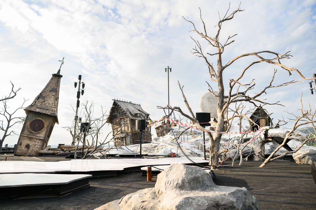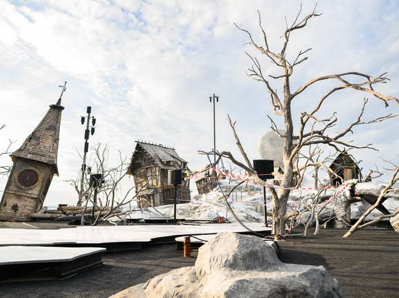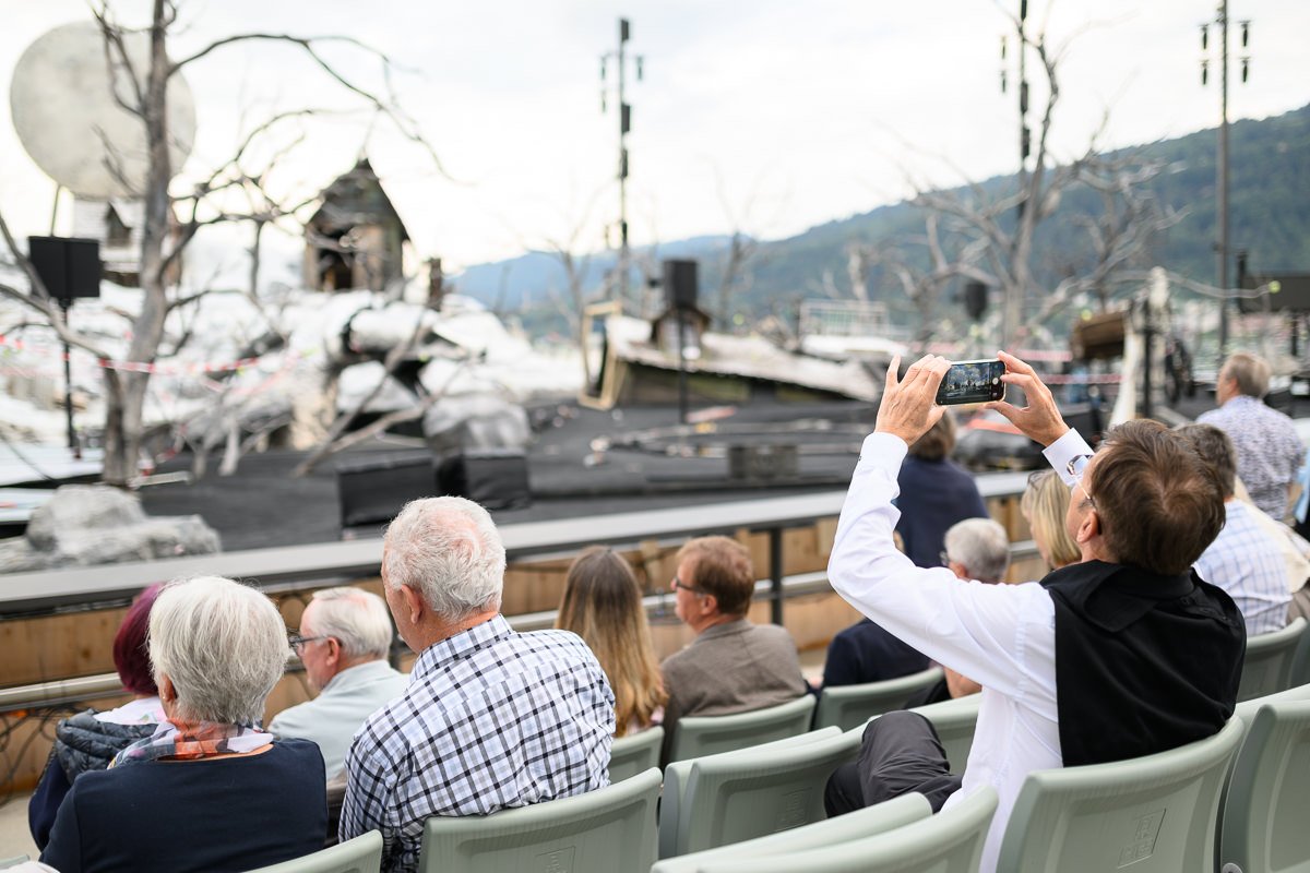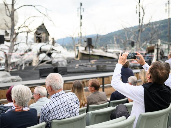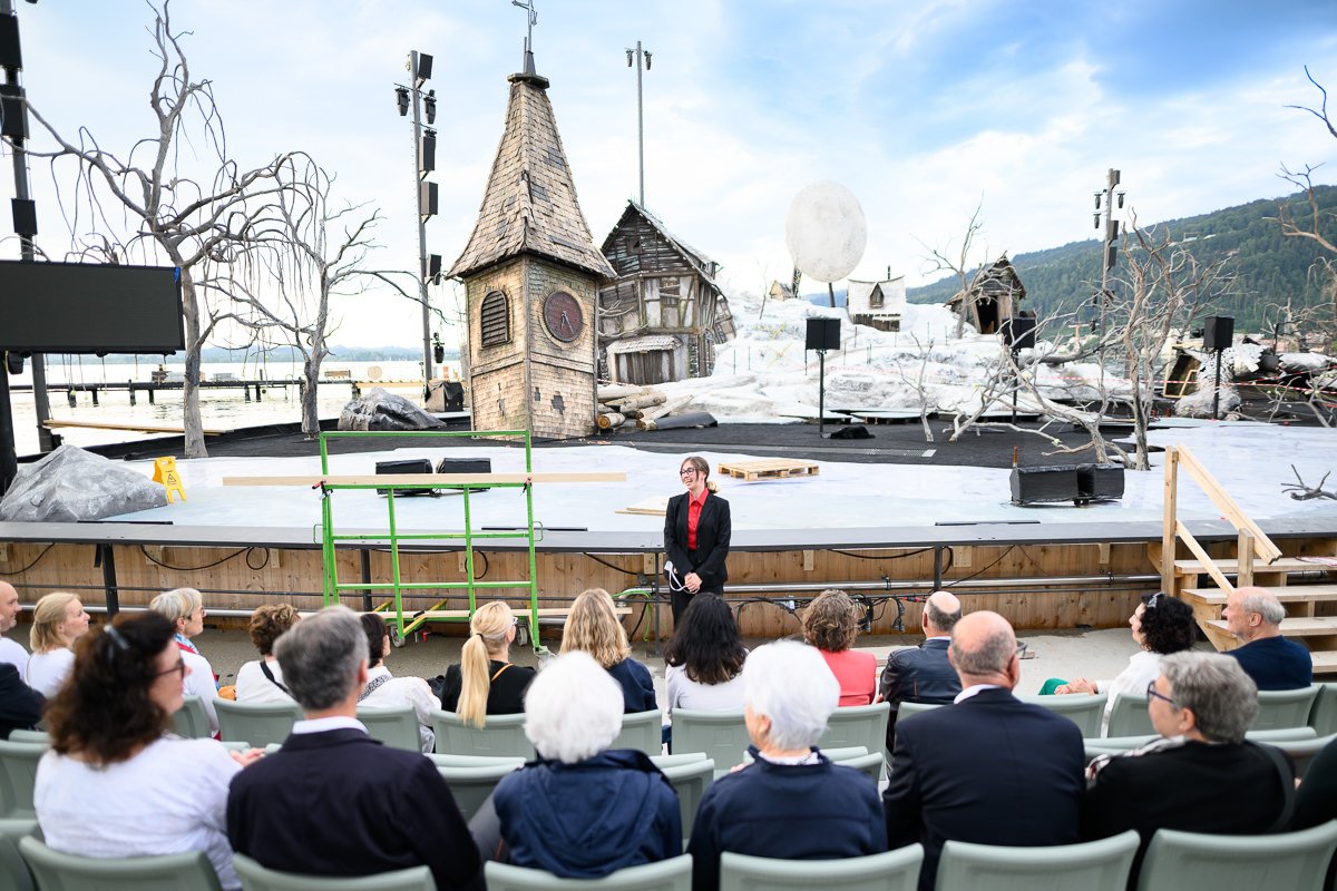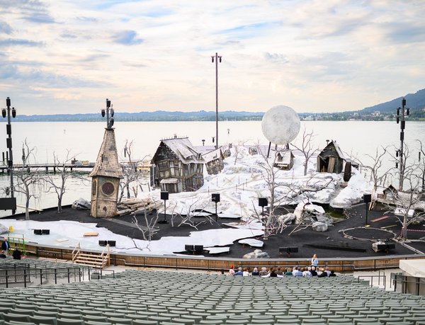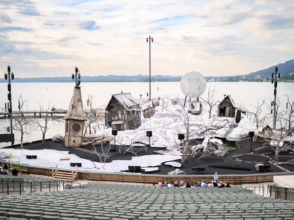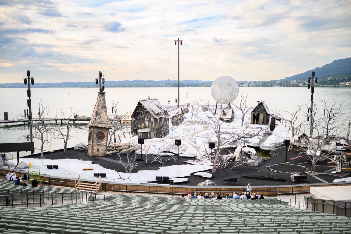 Die Bühne durfte aus Sicherheitsgründen noch nicht betreten werden, aber die Anwesenden waren auf der Tribüne eine der Ersten, die einen Blick aus nächster Nähe auf das spektakuläre Bühnenbild werfen konnten. Regisseur und Bühnenbildner Philipp Stölzl kehrte nach „Rigoletto“ (2019/21) für Carl Maria von Webers romantische Oper „Der Freischütz“ an den Bodensee zurück und hat wieder alle Register gezogen. Die Szenerie der romantischen Oper ist ein gespenstisches Dorf aus Stahl, Styropor und Hunderten Festmetern Holz. Dafür wurde an der Ufermauer eine 1.400 Quadratmeter große künstliche Lagune angelegt, die die Seebühne in eine winterliche Sumpflandschaft verwandelt. Das Bühnenbild soll aussehen wie ein Dorf nach dem Dreißigjährigen Krieg und die Atmosphäre das Publikum selbst bei sommerlicher Hitze frösteln machen, denn „Der Freischütz" ist im Grunde eine dunkle Faust-Geschichte: Max verkauft seine Seele für ein irdisches Glück und bezahlt bitter dafür.
