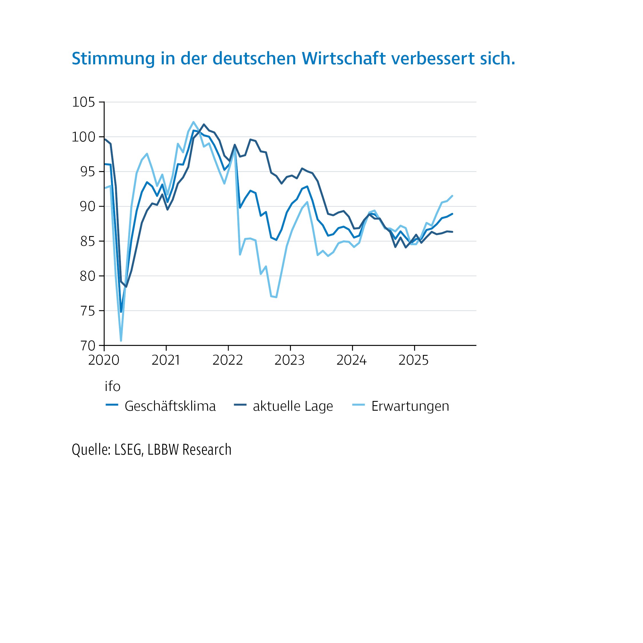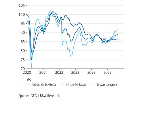 Für Ende 2025 und besonders für 2026 wächst die Hoffnung auf einen wirtschaftlichen Aufschwung. Damit diese Erwartungen nicht enttäuscht werden, bräuchte es laut der Landesbank Baden-Württemberg verlässliche politische Rahmenbedingungen: klare Vorgaben für Unternehmen und Investitionen in die öffentliche Infrastruktur. Erst im kommenden Jahr ist mit dauerhaft positiven Wachstumsraten zu rechnen.