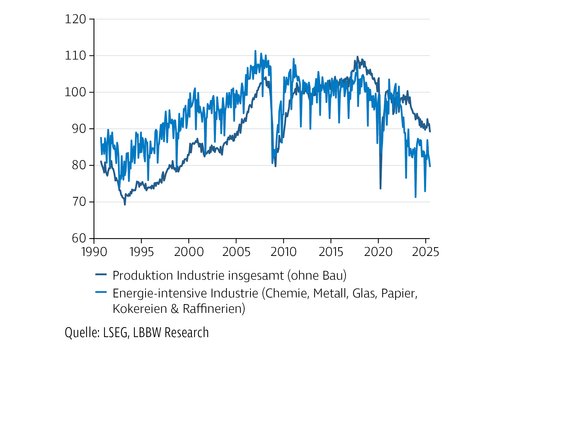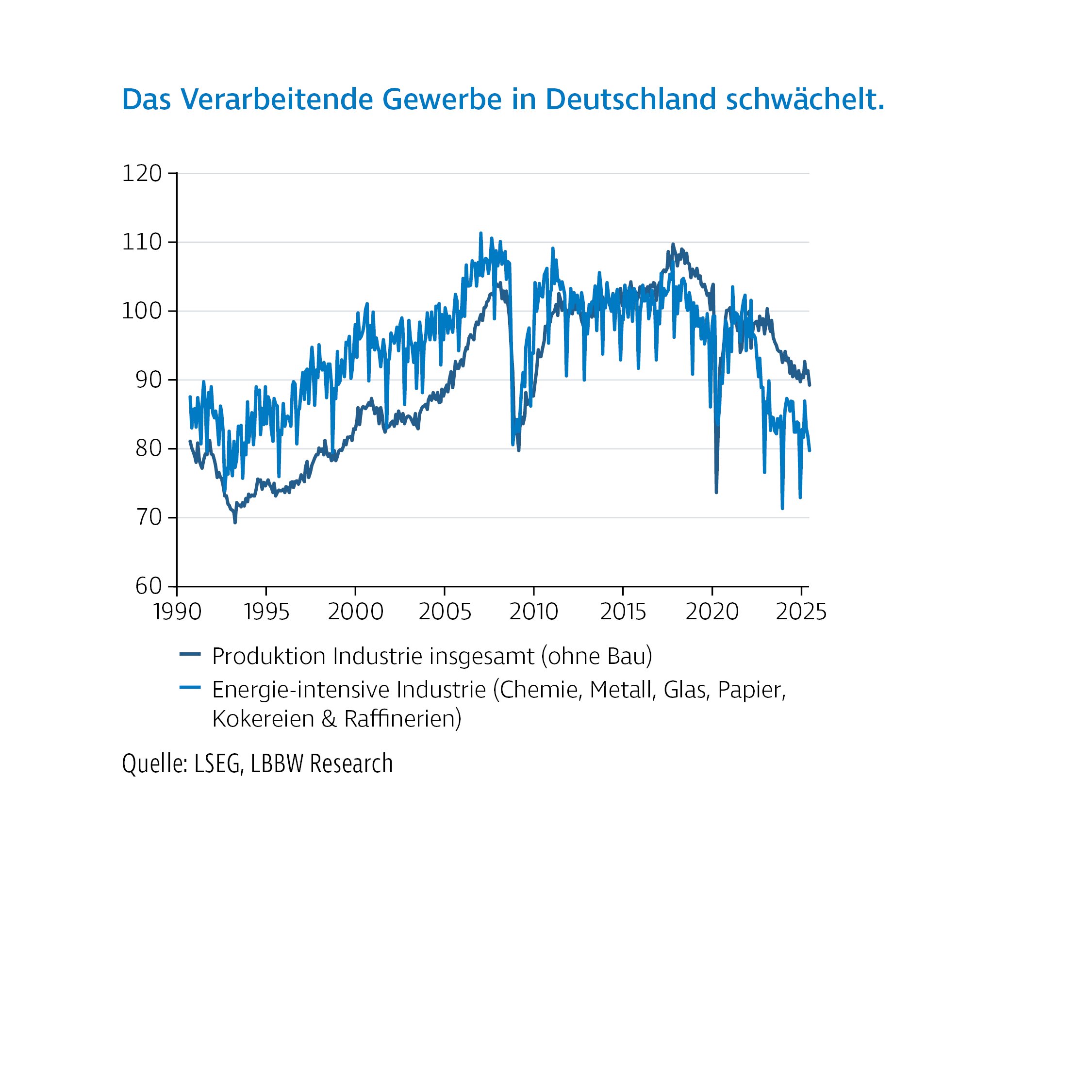 Zur Jahresmitte verzeichnete die deutsche Wirtschaft lediglich ein geringes Wachstum von 0,2 Prozent im Vergleich zum Vorjahr. Damit bleibt Deutschland deutlich hinter anderen großen Volkswirtschaften zurück: Im Euroraum stieg das Bruttoinlandsprodukt im selben Zeitraum um 1,4 Prozent, in den Vereinigten Staaten sogar um 2,0 Prozent. Das verarbeitende Gewerbe, Kernstück der deutschen Wirtschaft, verzeichnet seit Mitte 2022 überwiegend Produktionsrückgänge – besonders bei energieintensiven Branchen. Auch Österreich befindet sich weiterhin in einer wirtschaftlich angespannten Lage. Nach zwei Jahren Rezession bleibt Österreichs Wirtschaft 2025 laut WIFO weitgehend stagnierend, bevor 2026 ein moderater Aufschwung von rund 1,2 Prozent erwartet wird.