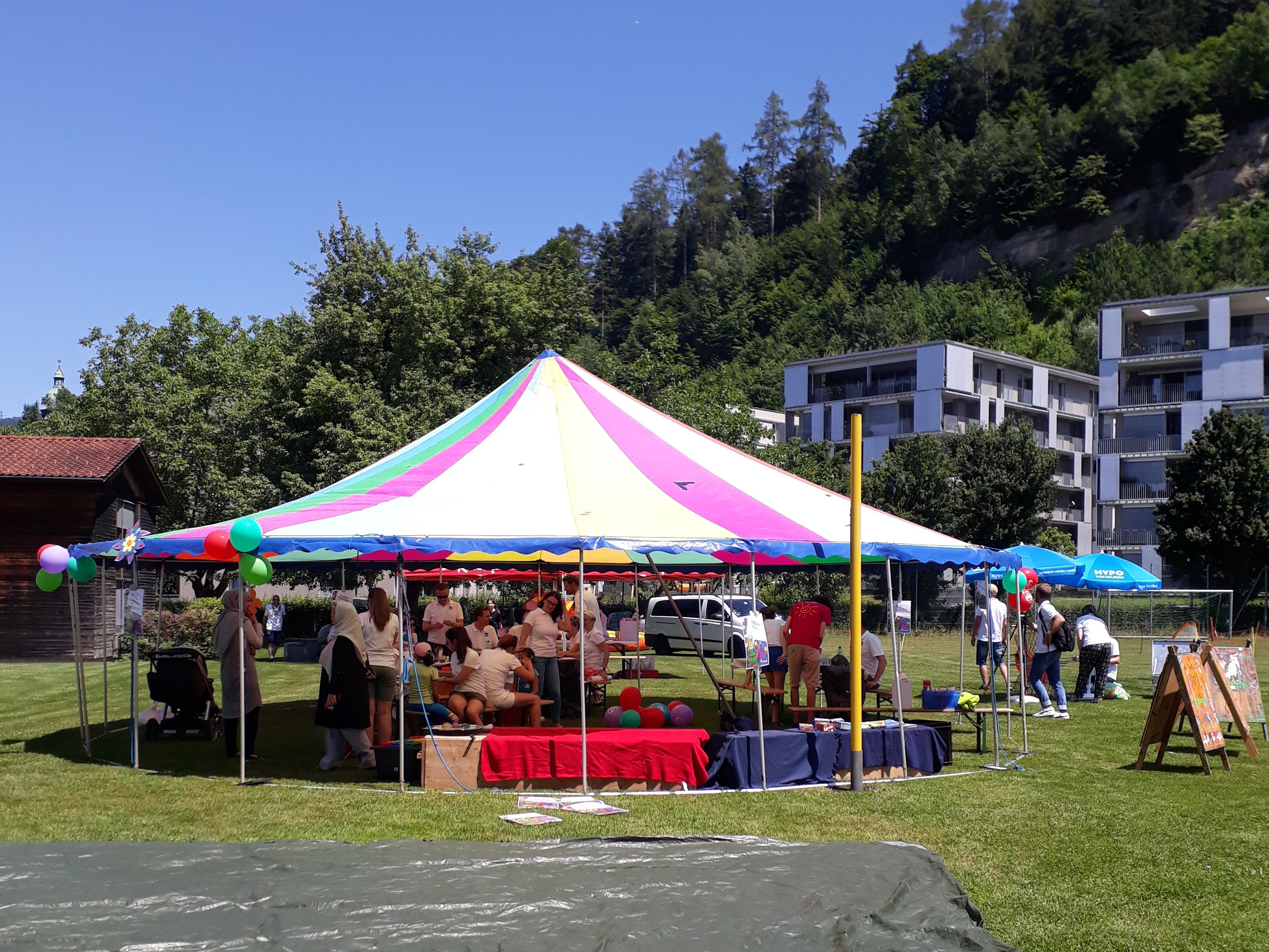 Unter strahlend blauem Himmel verwandelten über 70 Mitarbeiter des Hypo Vorarlberg-Konzerns das Kinderdorf-Areal in eine Spielwiese und bescherten den fast 100 teilnehmenden Kindern einen unvergesslichen Nachmittag mit spannenden Spielen und Bastelstationen, einer Hüpfburg, einem Eiswagen und vielem mehr. Auch die Vorstände ließen es sich nicht nehmen, mit vollem Einsatz bei den einzelnen Stationen mitzuhelfen.