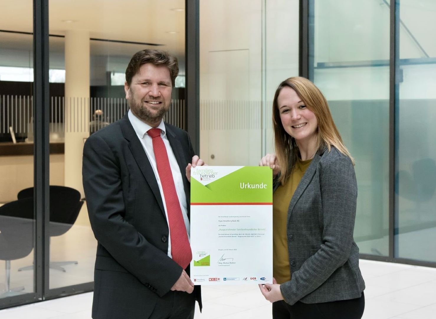 Coronabedingt fand die Verleihung mit Rekordbeteiligung im Rahmen eines Pressefoyers mit Landeshauptmann Markus Wallner statt. Insgesamt wurde die begehrte Auszeichnung heuer an 137 Vorarlberger Unternehmen vergeben. Die Hypo Vorarlberg zählt dabei zu den wenigen Unternehmen, die seit Beginn der Initiative 1998 an der Bewertung teilnehmen.