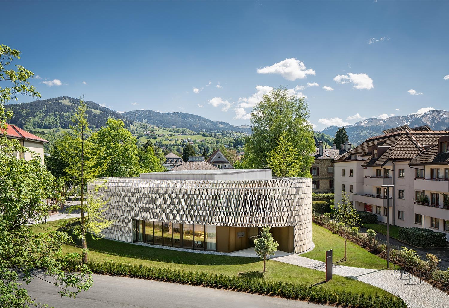 Vom Dornbirner Bahnhofsquartier aus ging es weiter zum nächsten Highlight: der Stadtbibliothek Dornbirn. Der optische Hingucker in Form eines ovalen, modernen Pavillons steht im starken Kontrast zu den umlegenden rechtwinkligen Bauten. Konzipiert wurde die generationsübergreifende Begegnungszone des Lernens als Gemeinschaftsprojekt der Architekturbüros Dietrich Untertrifaller und Christian Schmoelz. Das Verständnis der Bibliothek als öffentliches Wohnzimmer für neugierige Menschen zeigt sich unter anderem in den 8.000 Keramik-Elementen, die das Glasgebäude umgeben, Energiekosten sparen und an Bücher in Regalen erinnern.
