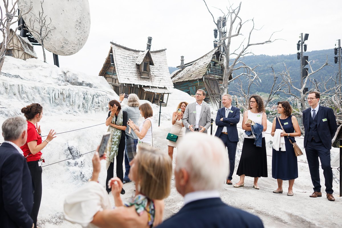In diesen Genuss kamen kürzlich auch rund 120 Kundinnen und Kunden der Hypo Vorarlberg. Nach Begrüßung durch Festspiel-Direktor Michael Diem und Hypo Vorarlberg Vorstand Wilfried Amann im Seefoyer erhielten die Gäste spannende Einblicke hinter die Kulissen der Seebühne. Regisseur und Bühnenbildner Philipp Stölzl kehrte nach „Rigoletto“ (2019/21) für Carl Maria von Webers romantische Oper an den Bodensee zurück und hat wieder alle Register gezogen. Die Szenerie ist ein gespenstisches Dorf aus Stahl, Styropor und Hunderten Festmetern Holz. Dafür wurde an der Ufermauer eine 1.400 Quadratmeter große künstliche Lagune angelegt, die die Seebühne in eine winterliche Sumpflandschaft verwandelt. Das Bühnenbild soll aussehen wie ein Dorf nach dem Dreißigjährigen Krieg und die Atmosphäre das Publikum selbst bei sommerlicher Hitze frösteln machen, denn „Der Freischütz" ist im Grunde eine dunkle Faust-Geschichte: Max verkauft seine Seele für ein irdisches Glück und bezahlt bitter dafür.