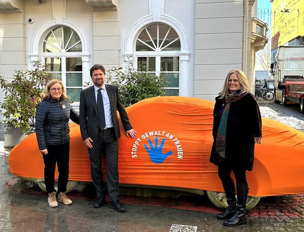 Die Hypo Vorarlberg stellt ihren Betonporsche, der seinen Platz vor der Zentrale in Bregenz hat, für die Aktion zur Verfügung. In Kooperation mit den Soroptimistinnen wurde das Kunstwerk am Montagmittag mit einer orangen Hülle verdeckt – ein einfaches, wirkungsvolles und weithin sichtbares Mittel, um Solidarität auszudrücken. „Im Rahmen unseres gesellschaftlichen Engagements für eine lebenswerte Region schließen wir uns dieser Kampagne an. Wir setzen uns für eine gewaltfreie Gesellschaft ein und wollen damit ein wichtiges Zeichen gegen Gewalt an Frauen setzen“, erläutert Vorstandsvorsitzender Michel Haller.