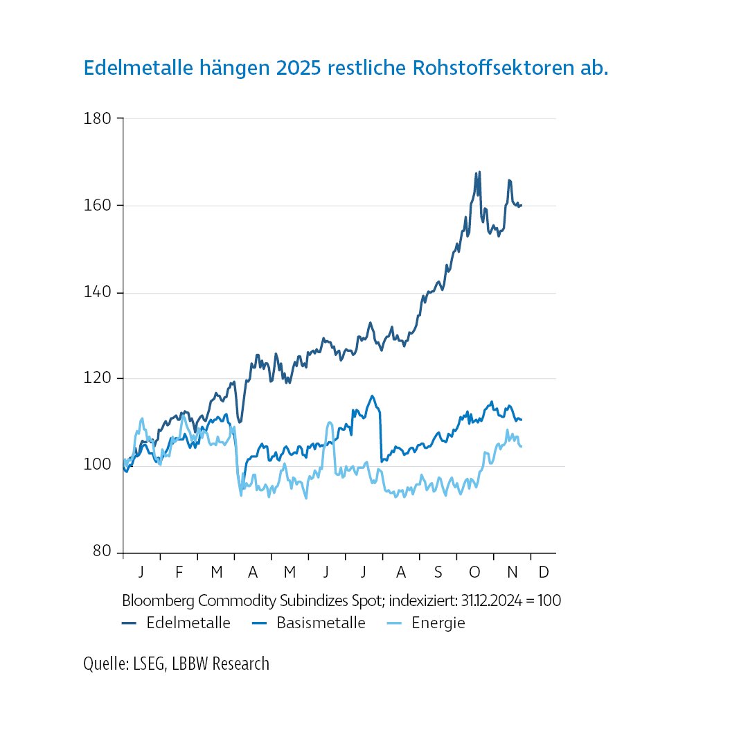 Edelmetalle konnten im Jahr 2025 deutlich zulegen. Trotz einer zwischenzeitlichen Konsolidierung bleiben die grundlegenden Treiber bestehen. Sinkende Zinsen in den USA, ein tendenziell schwächerer US-Dollar sowie anhaltende Unsicherheiten in der Geld- und Handelspolitik sprechen weiterhin für eine stabile Nachfrage. Zusätzlich dürften börsengehandelte Rohstoffprodukte auch 2026 eine wichtige Rolle auf der Nachfrageseite spielen, nachdem ihre Bestände im Jahr 2025 spürbar ausgeweitet wurden.