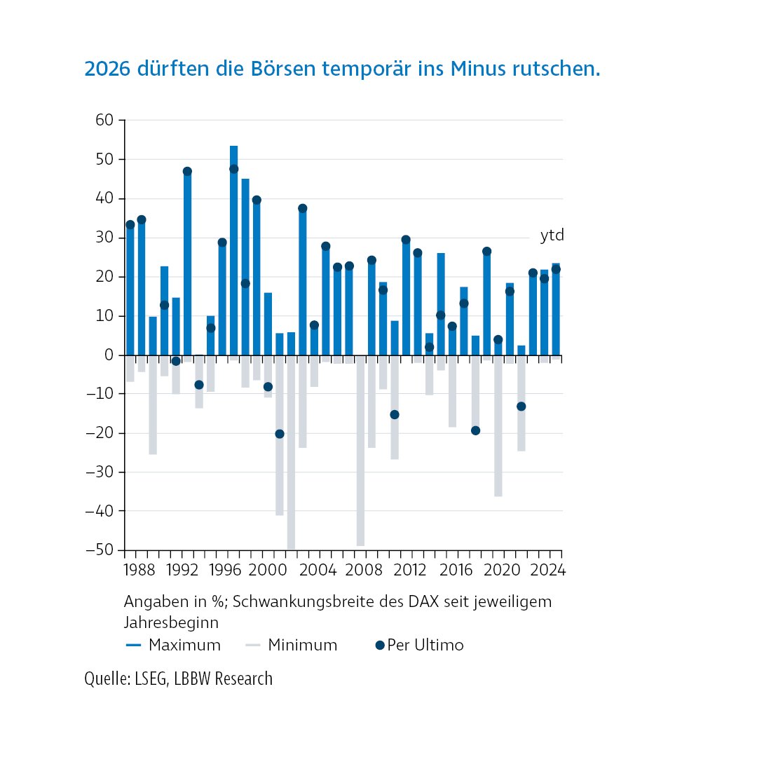 Eine moderatere Gewinnentwicklung könnte die Bewertungsniveaus großer US-Technologiewerte stärker in den Fokus der Anleger:innen rücken. Für Investoren aus dem Euroraum bleibt zudem die Entwicklung der Wechselkurse ein relevanter Faktor, da geld- und währungspolitische Maßnahmen in den USA zunehmend strategisch eingesetzt werden. Für das Jahr 2026 zeichnet sich ein Marktumfeld ab, das von höherer Selektivität und zeitweiser Zurückhaltung geprägt sein dürfte. Außerhalb des US-Schwerpunkts bieten sich dabei interessante Perspektiven: Europäische und asiatische Aktienmärkte weisen im Vergleich attraktivere Bewertungen auf. Insbesondere nachhaltig dividendenstarke Unternehmen sowie solide aufgestellte mittelgroße Werte könnten hiervon profitieren.