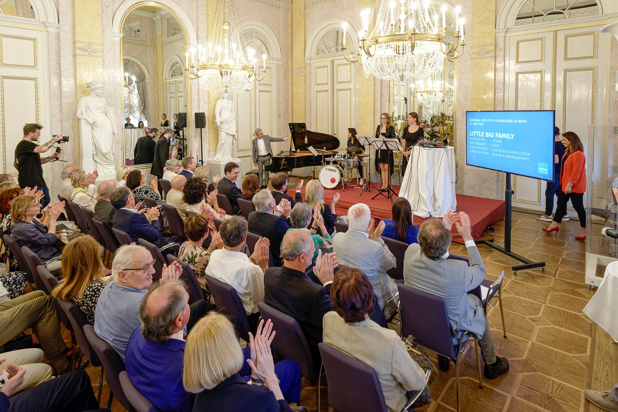Christoph Moser mit der Little Big Family sorgte für die passende musikalische Umrahmung des Abends: Er nahm die Gäste mit auf eine musikalische Reise von Vorarlberg in die Welt hinaus, zurück nach Europa bis ins "Hoamatle" der Bank in Vorarlberg und schließlich wieder nach Wien. Hier endete der Ausflug mit Beethovens' Klängen.